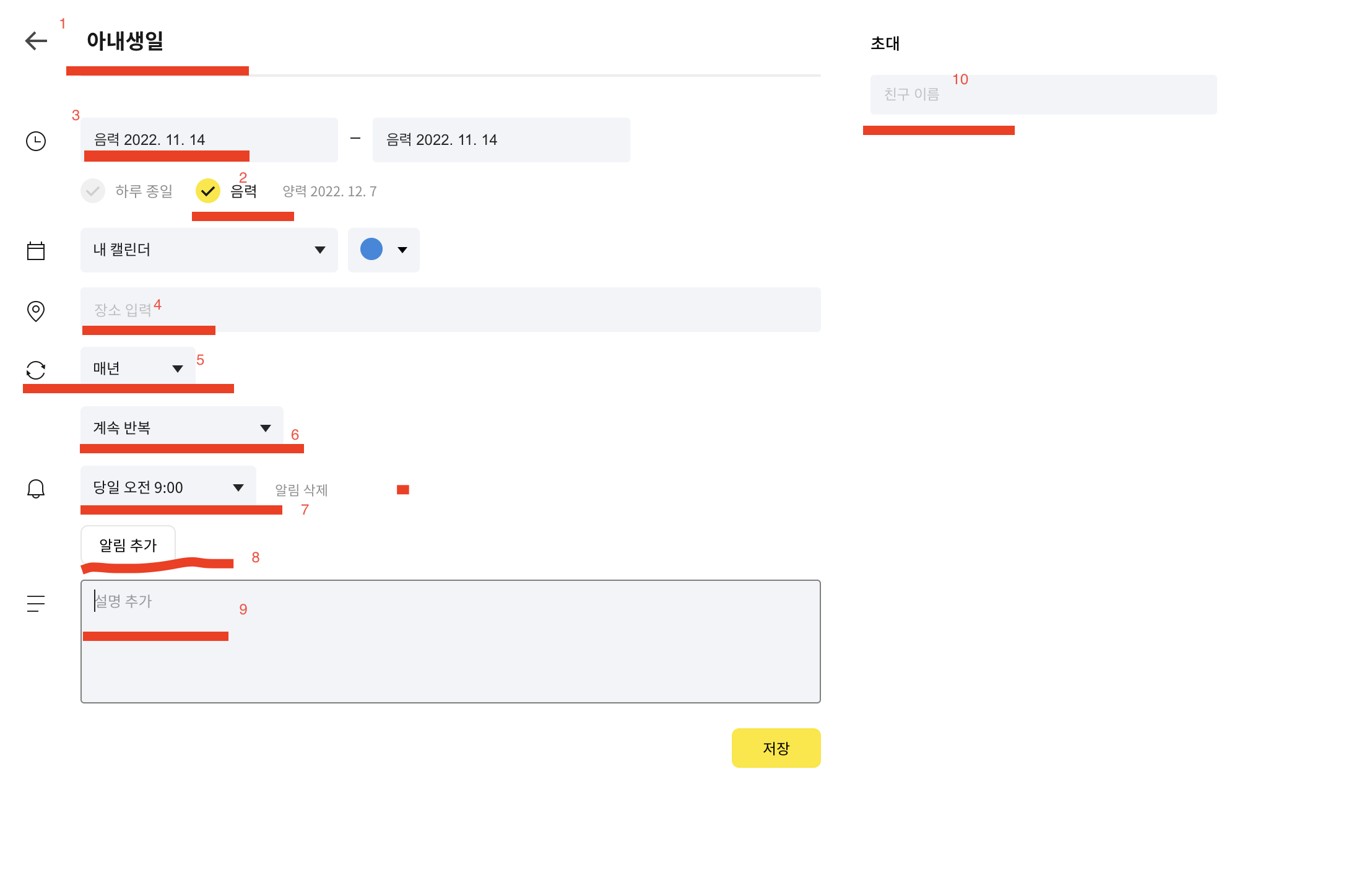 같은 방법으로 가족, 연인, 친구, 비즈니스상 필요한 분들의 기념일을 일정으로 등록하면 된다. 다른 캘린더에도 있는 기능이지만 해당 일정을 공유하고 싶은 경우, 위 그림에서 10번에 해당되는 초대를 이용해서 카카오톡에 등록된 친구들을 초대하면, 내가 작성한 기념일을 공유하게 된다.