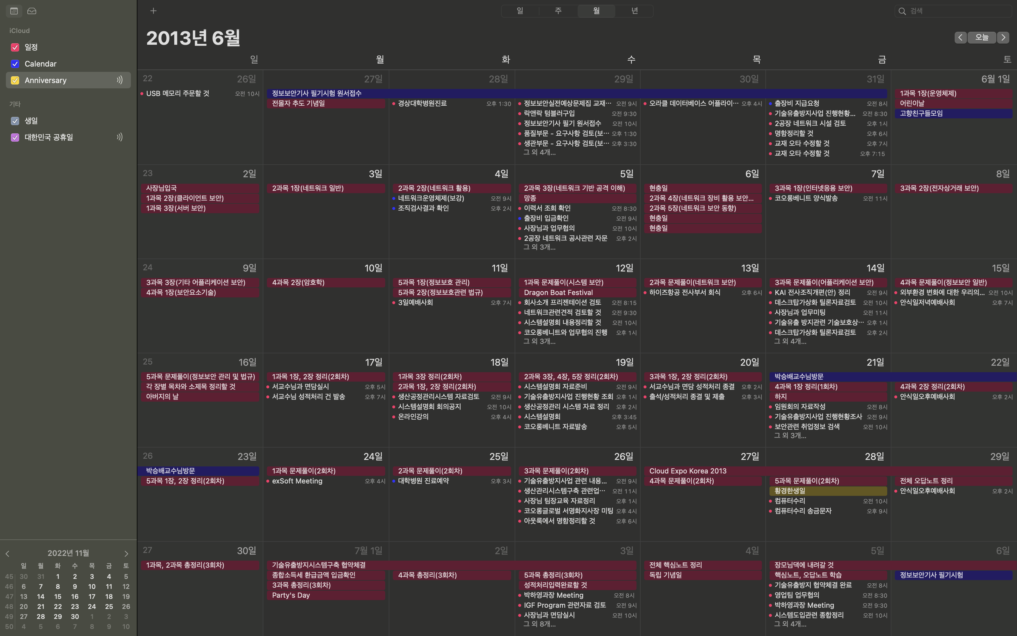 나는 아이클라우드를 통해 3개의 캘린더를 관리하고 있다. 하나는 회사 업무(일정)와 관련된 캘린더이고, 또 다른 하나는 개인적인 업무(Calendar)를 관리하는 캘린더이다. 또 다른 하나가 위에 노란색으로 표기된 음력으로 된 기념일(Anniversary)을 관리하는 캘린더이다.