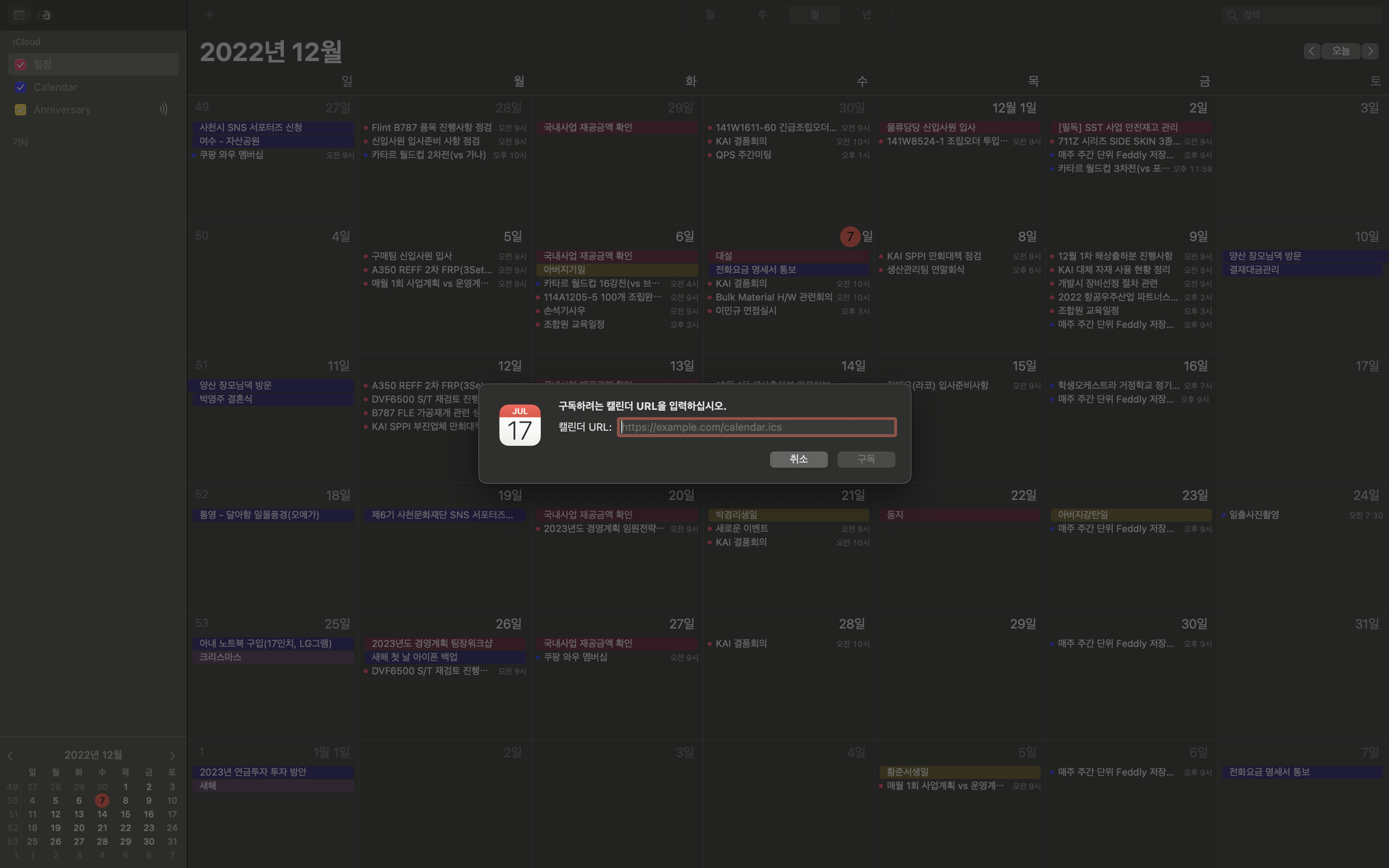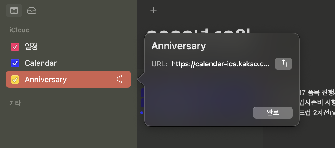 톡캘린더는 카카오톡과 연동이 되기 때문에 카카오톡과 연계하여 일정을 관리할 수 있는 장점이 있다. 그러나 나처럼 기존에 애플 캘린더나 구글 캘린더를 이용하고 있다면 사용하던 캘린더에서 모든 일정을 한 번에 관리하고 싶을 것이다. 그러기 위해서는 기존 관리하는 캘린더에서 구독 기능을 이용하여, 위 1 ~ 2의 과정에서 생성한 캘린더를 구독해야 한다.