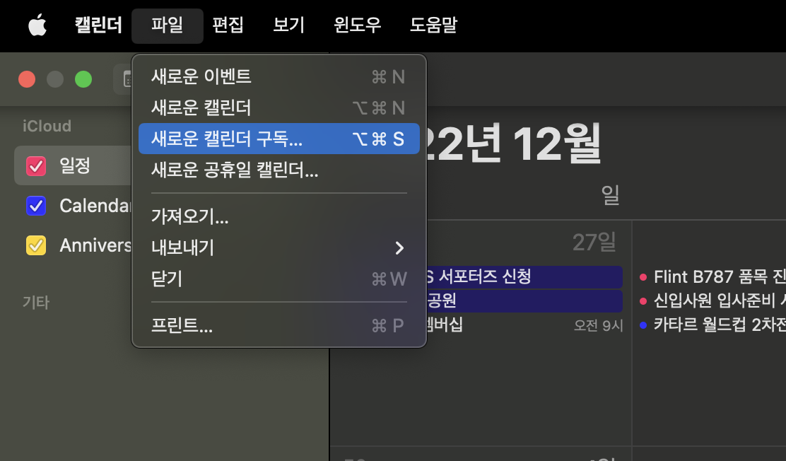 이제 앞서 복사한 주소를 이용하여 애플 캘린더에서 등록된 캘린더를 구독하면 된다. 먼저 아래와 같이 캘린더를 실행 후 '파일 > 새로운 캘린더 구독...'를 클릭한다.