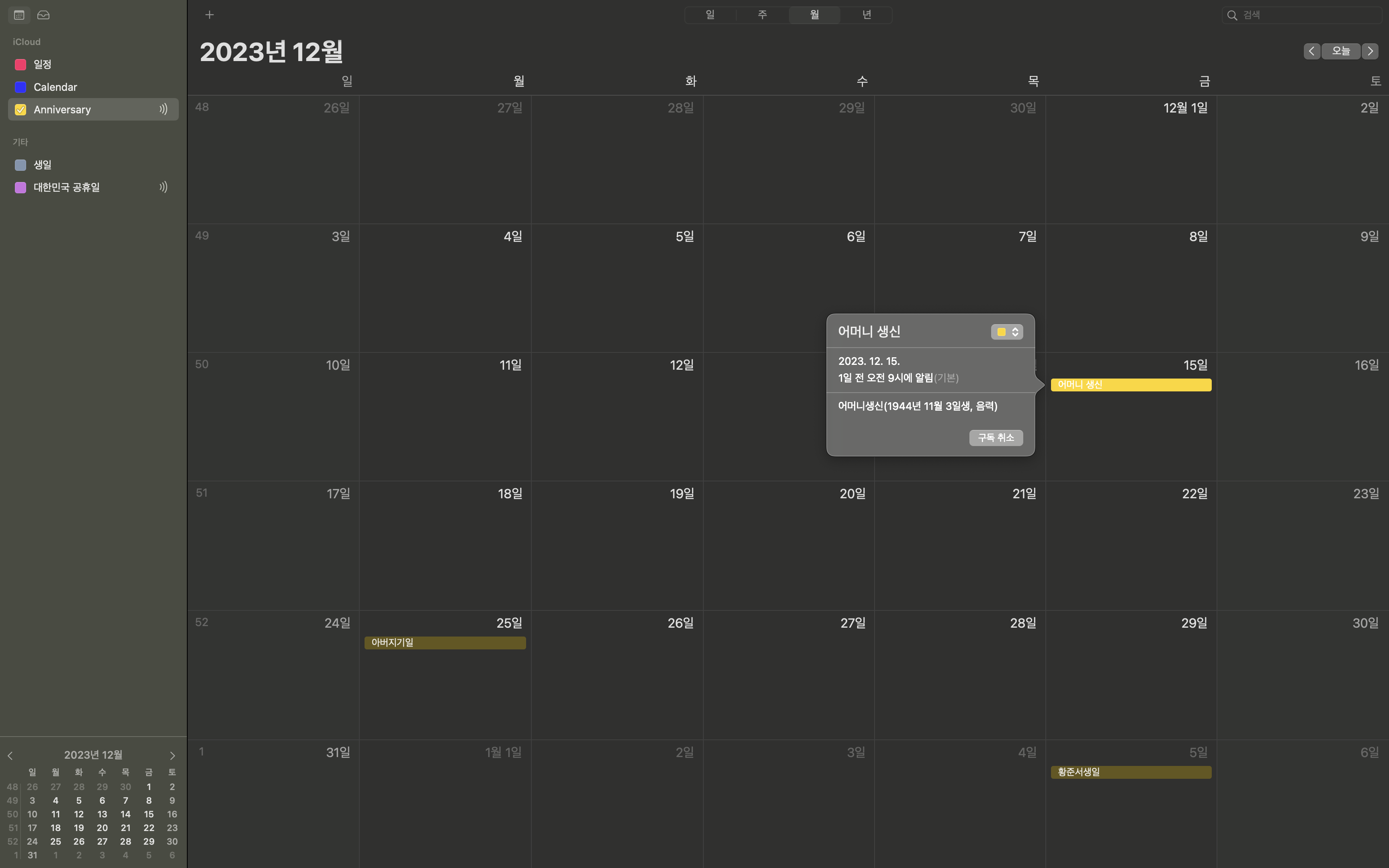 어머니는 음력으로 1944년 11월 3일생이다. 올해는 어머니 생신이 지나갔고, 다가오는 2023년에는 12월 15일이 어머니의 생신이다. 이렇게 음력을 자동으로 계산 후 양력으로 변환해서 하루 전에 알려준다.