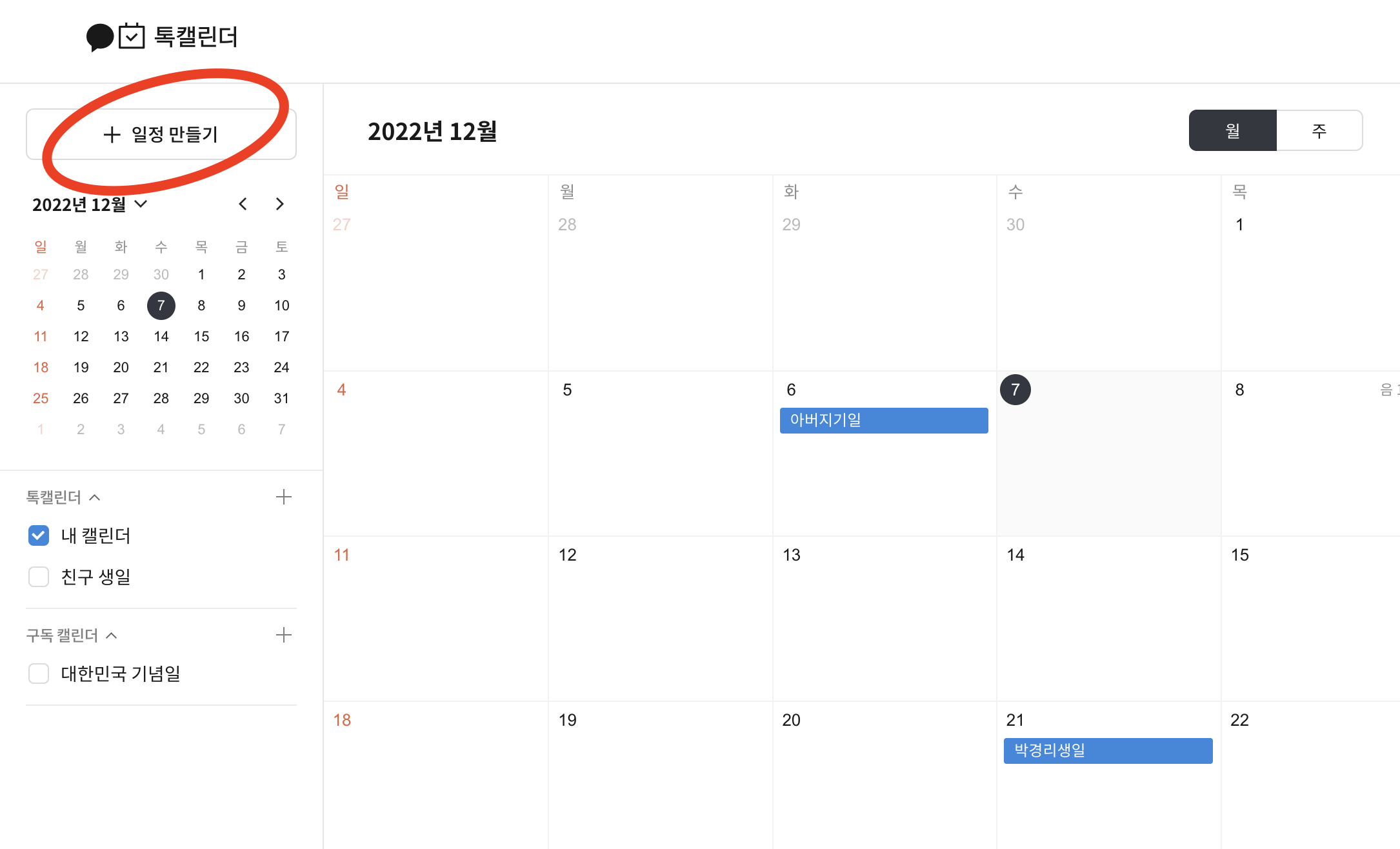 톡캘린더에 접속하면 위 그림과 같이 불필요한 친구 생일과 대한민국 기념일은 체크를 해제한다. 카카오톡에 등록된 친구들의 생일까지 전부 관리하겠다면 체크를 두어도 상관없다. 대한민국 기념일은 애플 캘린더에서 바로 구독을 하면 되기에 여기서는 체크를 해제하도록 한다.