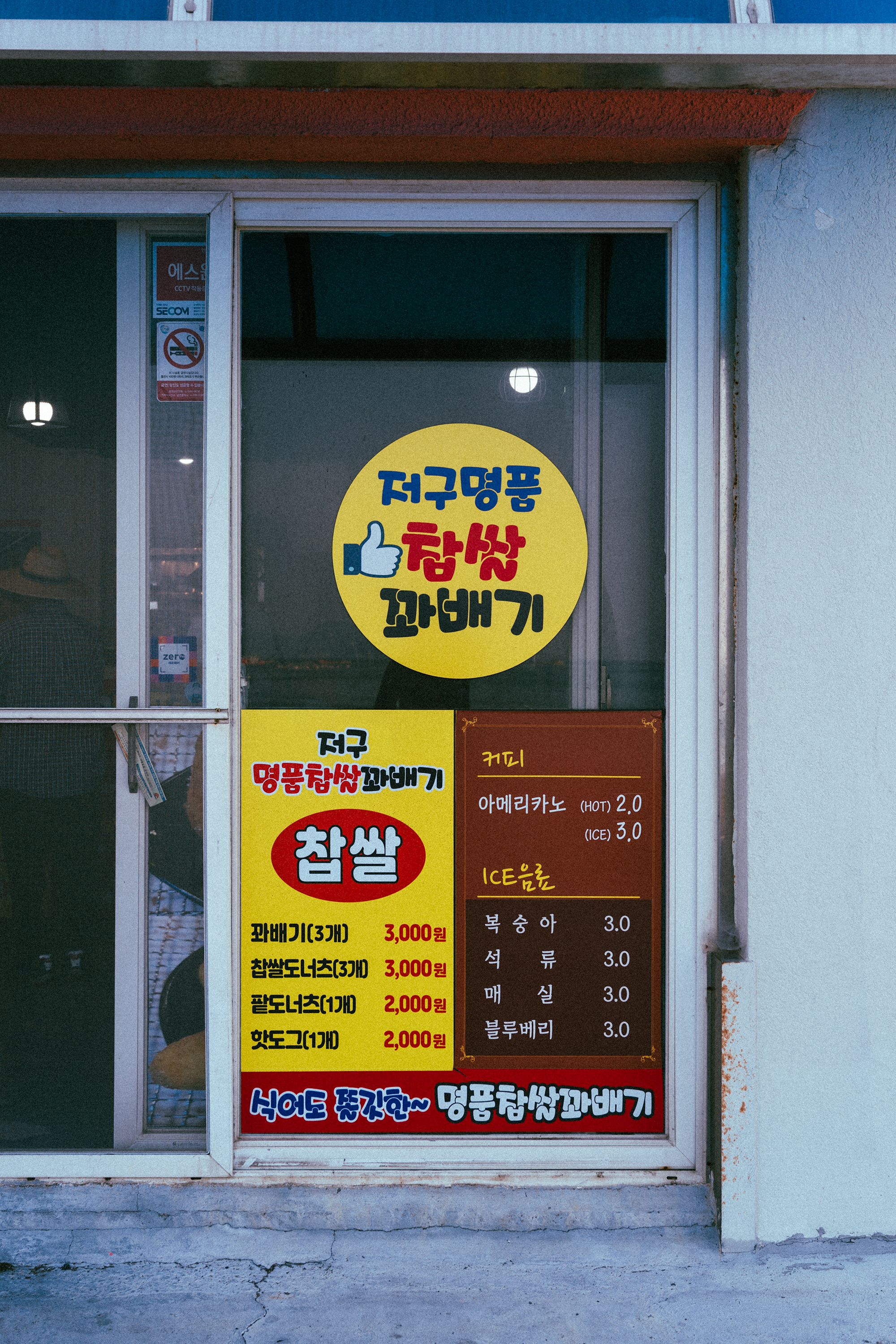 한참 걸었더니 배가 고파졌어요. 그때 눈에 띈 곳이 바로 “저구 명품찹살 꽈배기”였어요. 노란 간판이 유독 눈에 띄었고, 꽈배기, 도너츠, 핫도그, 커피까지 판매하고 있었어요.