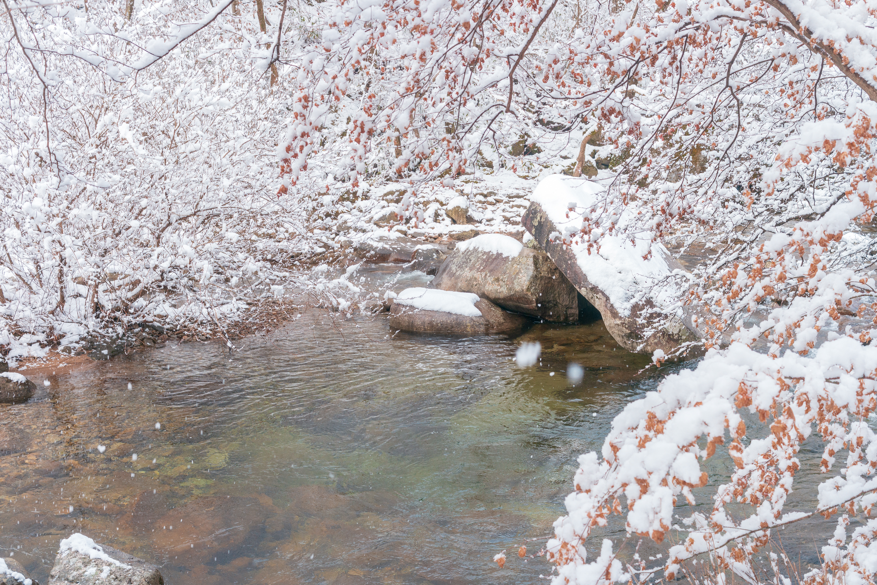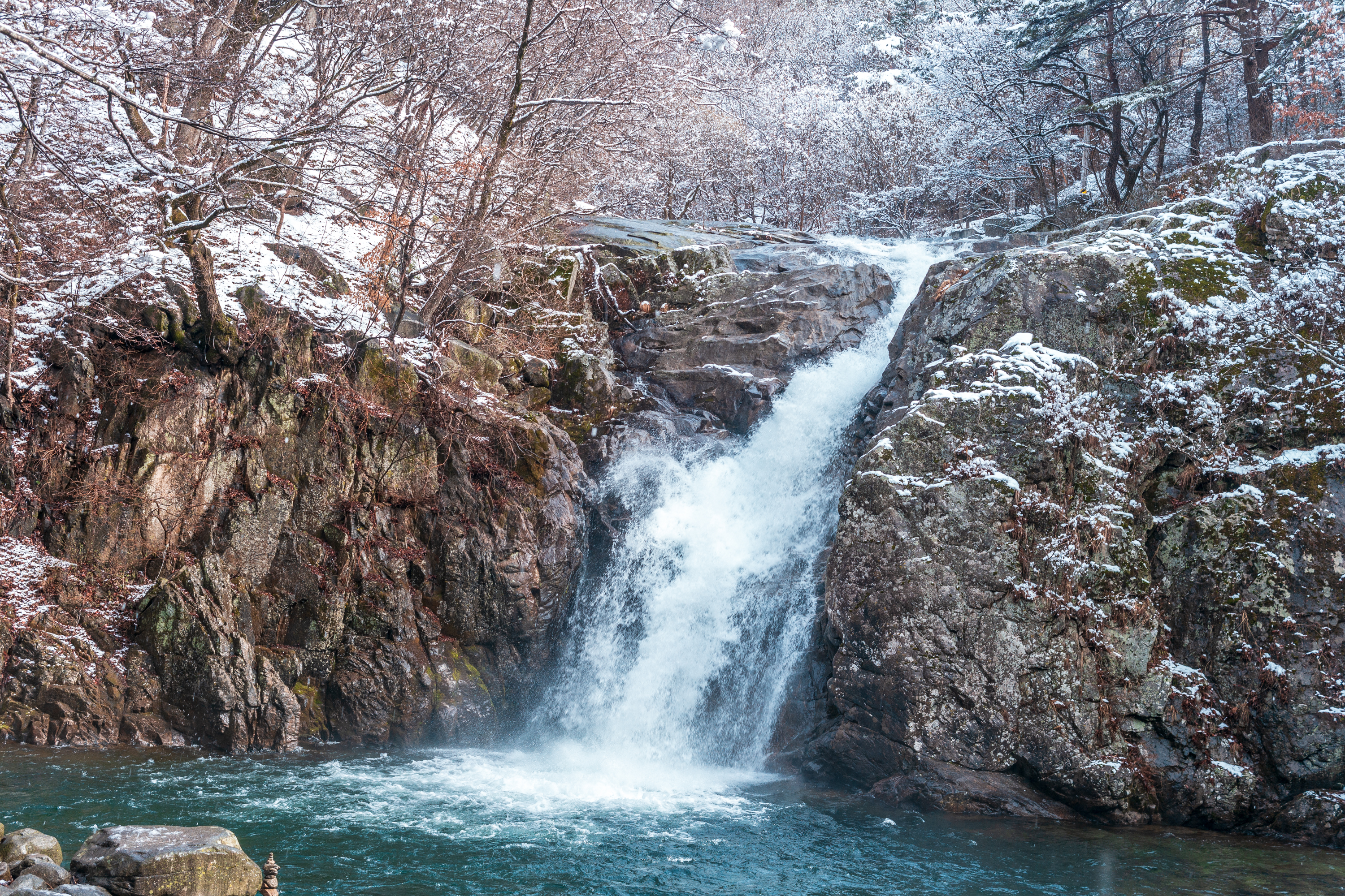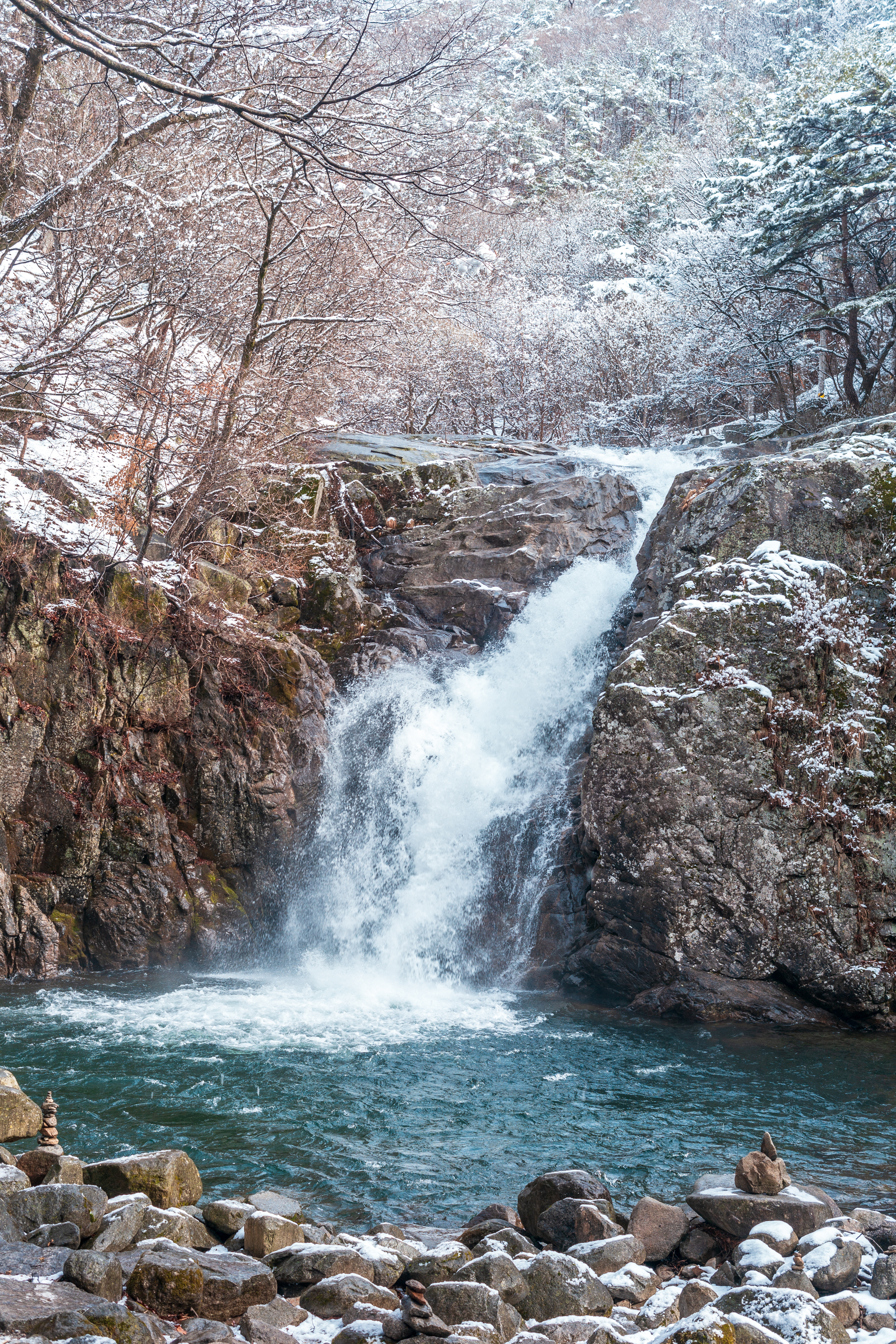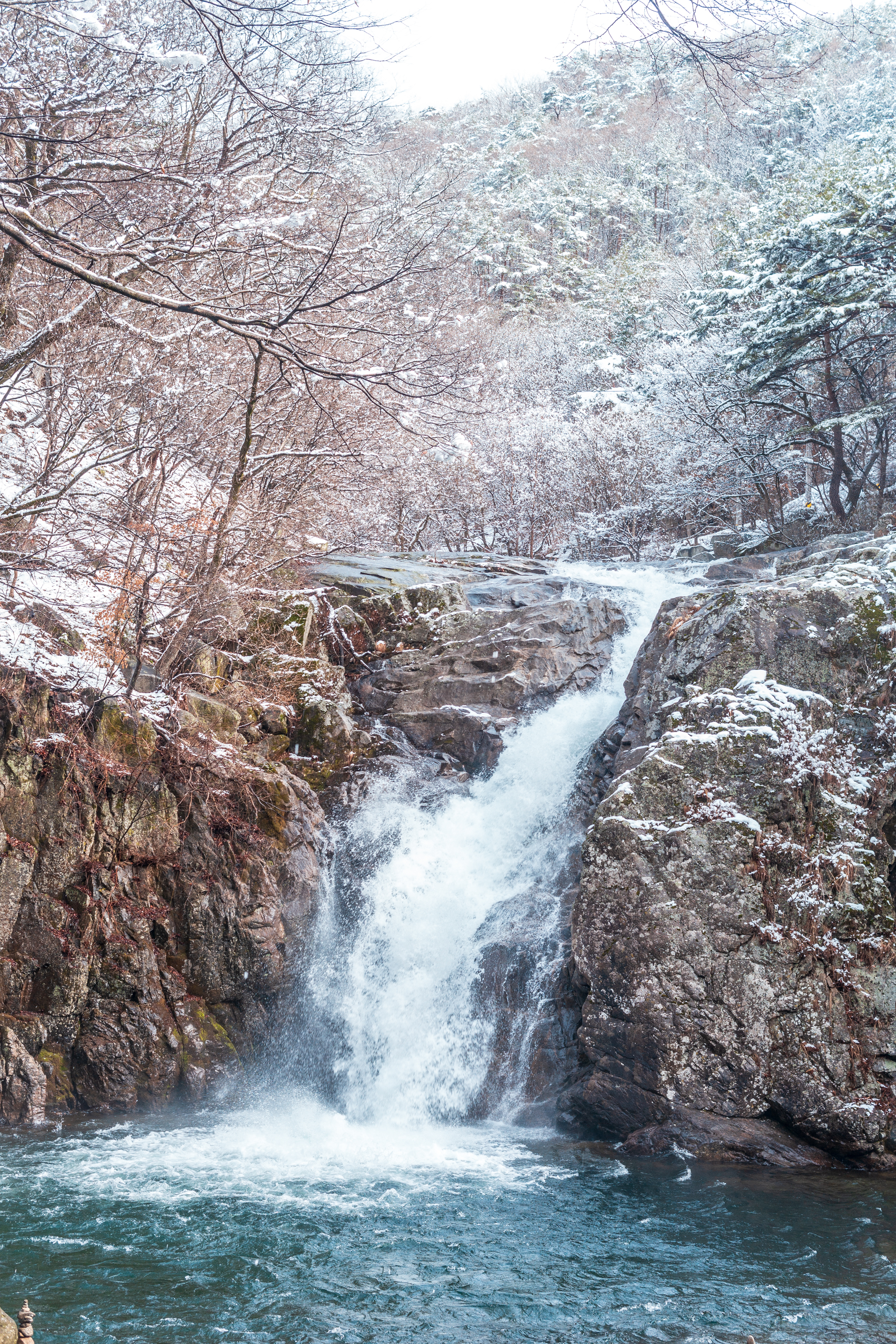 네! 계곡의 바위 위로 떨어지는 폭포, 눈 덮인 나무 길, 그리고 맑은 물이 흐르는 계곡 자체가 최고의 촬영 스팟입니다.