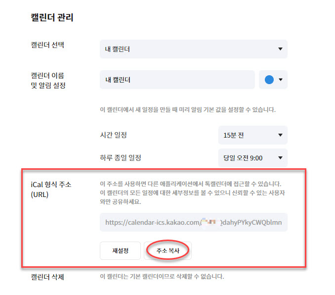 톡캘린더는 카카오톡과 연동이 되기 때문에 카카오톡과 연계하여 일정을 관리할 수 있는 장점이 있다. 그러나 나처럼 기존에 애플 캘린더나 구글 캘린더를 이용하고 있다면 사용하던 캘린더에서 모든 일정을 한 번에 관리하고 싶을 것이다. 그러기 위해서는 기존 관리하는 캘린더에서 구독 기능을 이용하여, 위 1 ~ 2의 과정에서 생성한 캘린더를 구독해야 한다.
