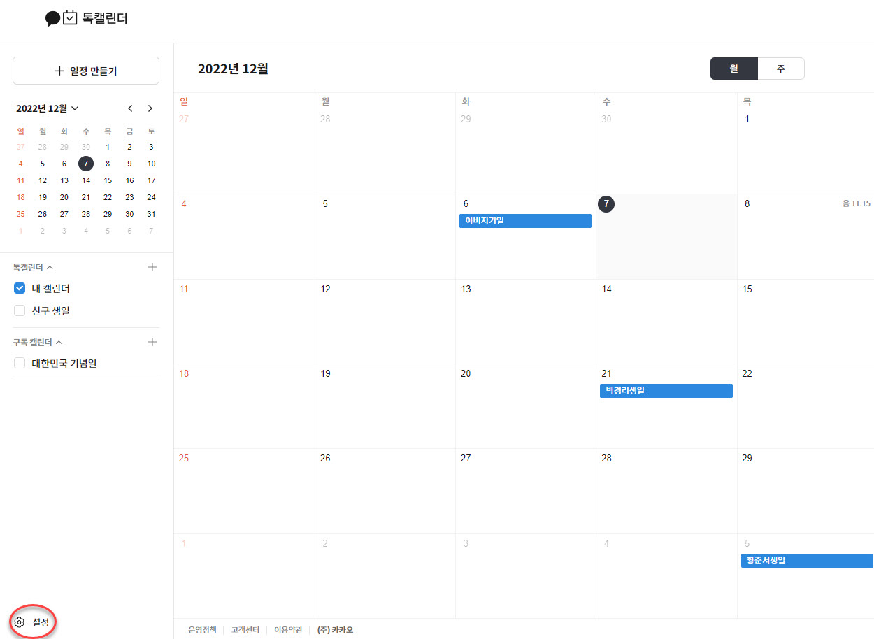 톡캘린더에 접속하면 위 그림과 같이 불필요한 친구 생일과 대한민국 기념일은 체크를 해제한다. 카카오톡에 등록된 친구들의 생일까지 전부 관리하겠다면 체크를 두어도 상관없다. 대한민국 기념일은 애플 캘린더에서 바로 구독을 하면 되기에 여기서는 체크를 해제하도록 한다.