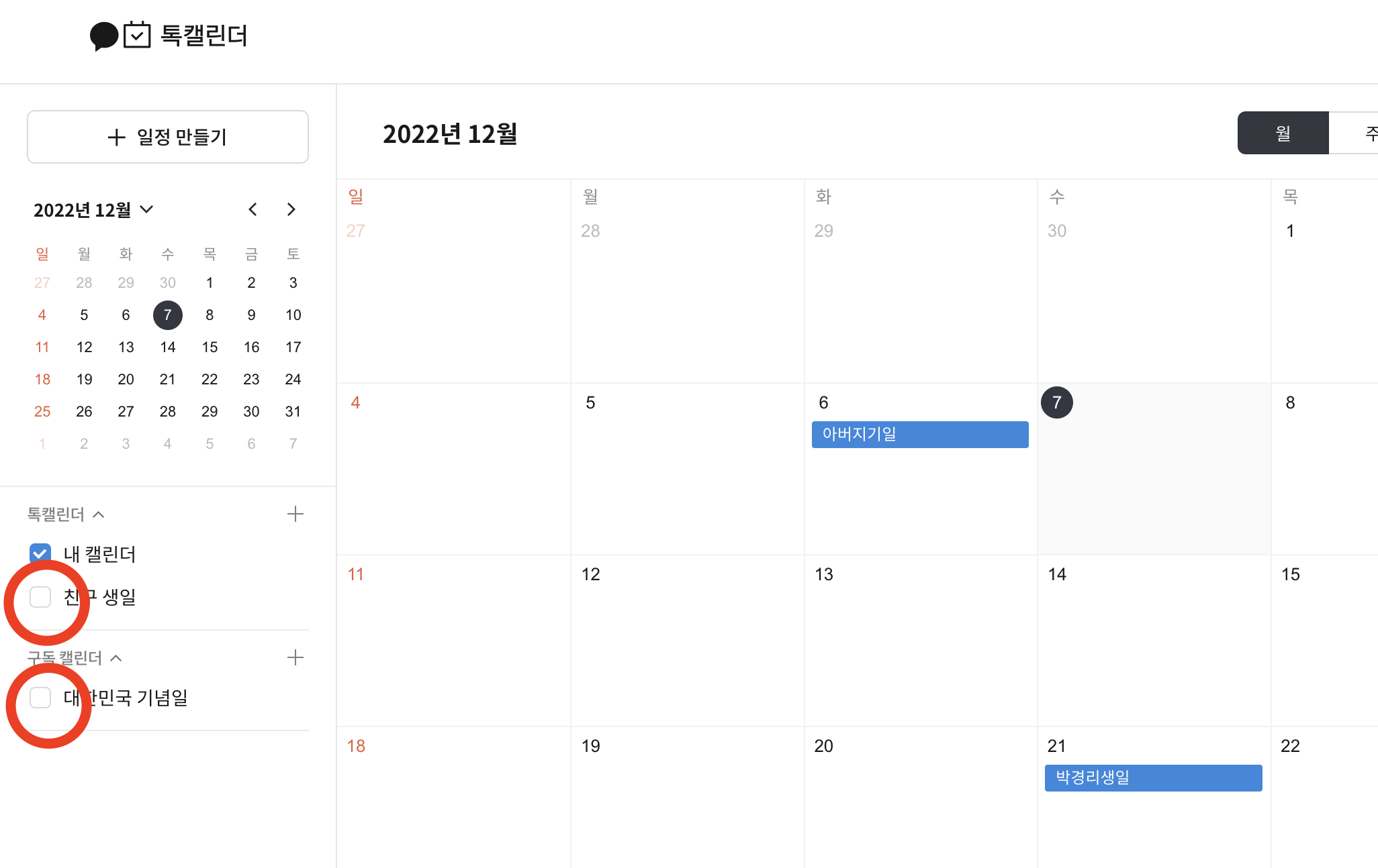톡캘린더에 접속하면 위 그림과 같이 불필요한 친구 생일과 대한민국 기념일은 체크를 해제한다. 카카오톡에 등록된 친구들의 생일까지 전부 관리하겠다면 체크를 두어도 상관없다. 대한민국 기념일은 애플 캘린더에서 바로 구독을 하면 되기에 여기서는 체크를 해제하도록 한다.