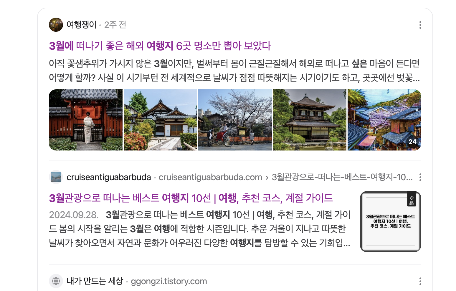1. 네이버 검색에서 상위 노출 블로그는 찾는다. 3월 시작되었으니 '3월에 가고 싶은 여행지'로 검색을 해 보았습니다.