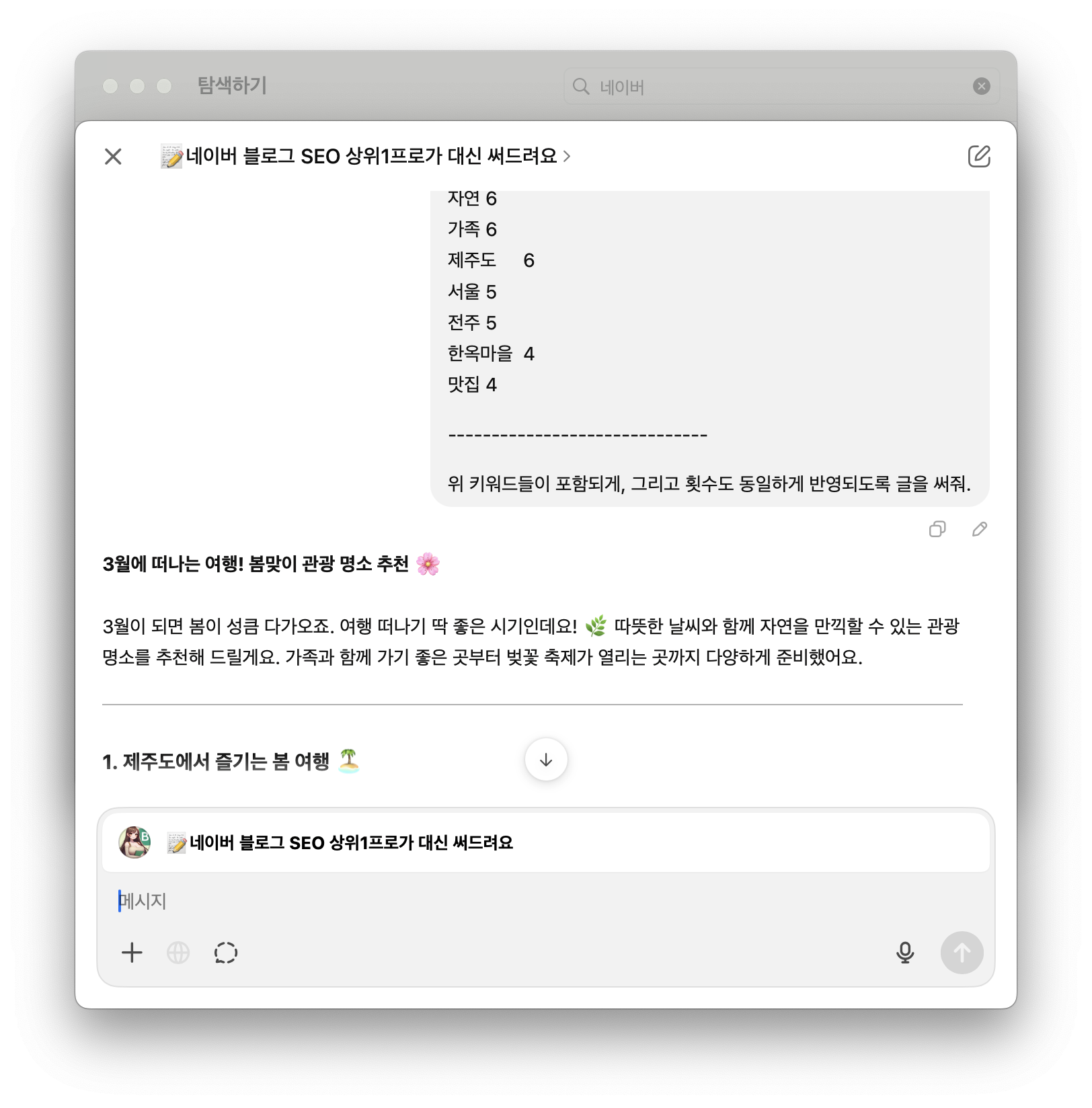 6. 이제 GPT에서 네이버 블로그 SEO에 최적화된 대화방을 찾아서 '초안'을 작성해 달라고 요청합니다. 여기서 해당 글의 키워드와 사용 빈도를 적용하여 글을 작성해 달라고 합니다.