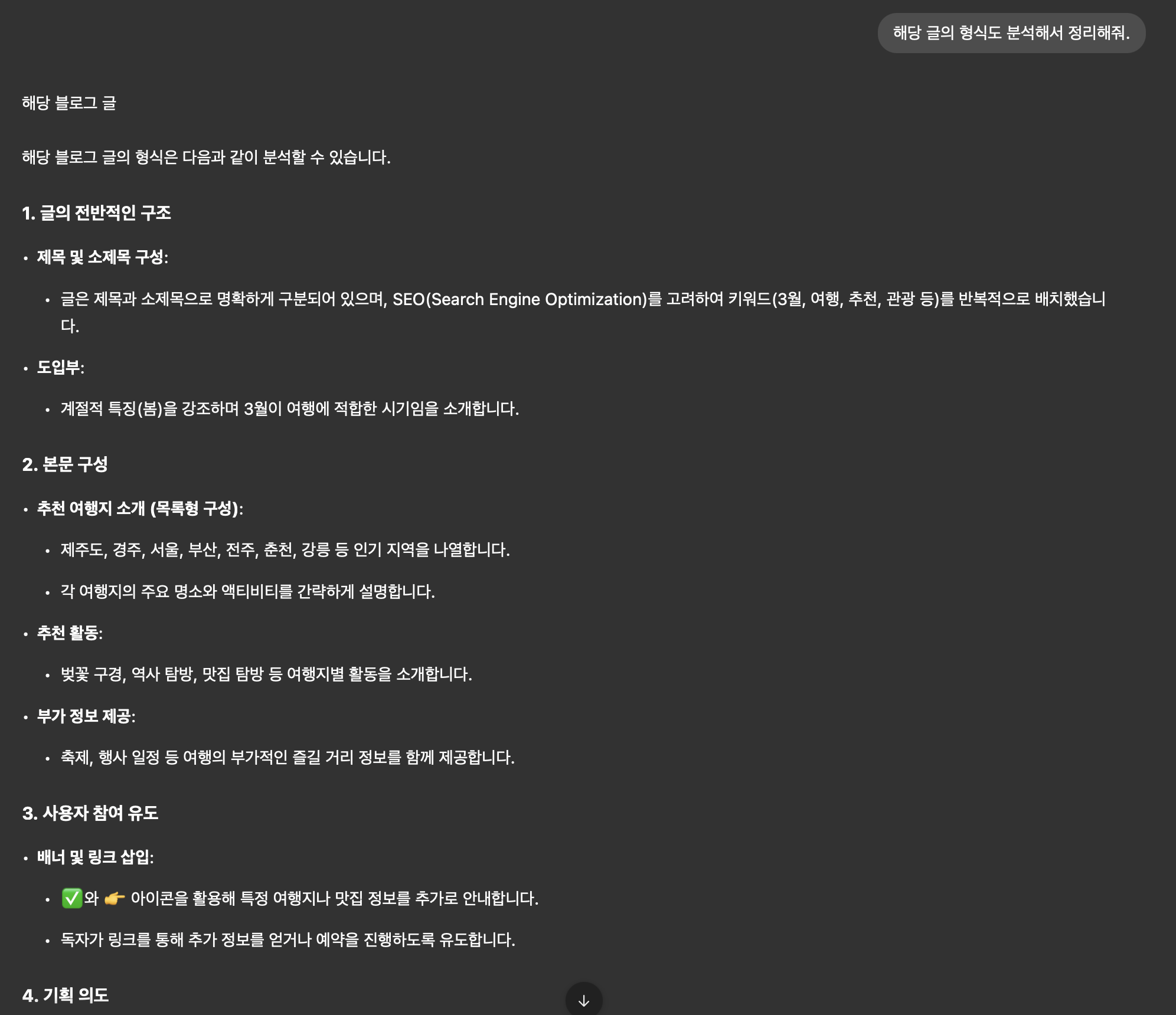 4. 이번에는 GPT를 사용해서 해당 글의 구조와 형식을 분석하라고 요청함.