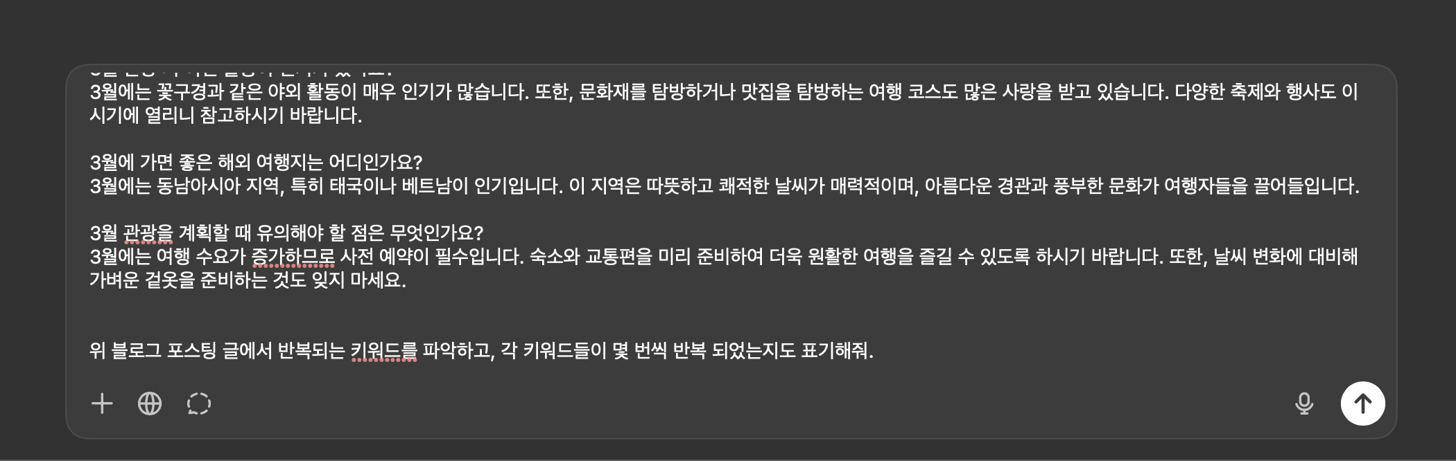 3. GPT에 타깃이 된 글의 내용을 가져와 반복되는 키워드와 해당 키워드의 사용 빈도를 파악해 달라고 요청합니다.
