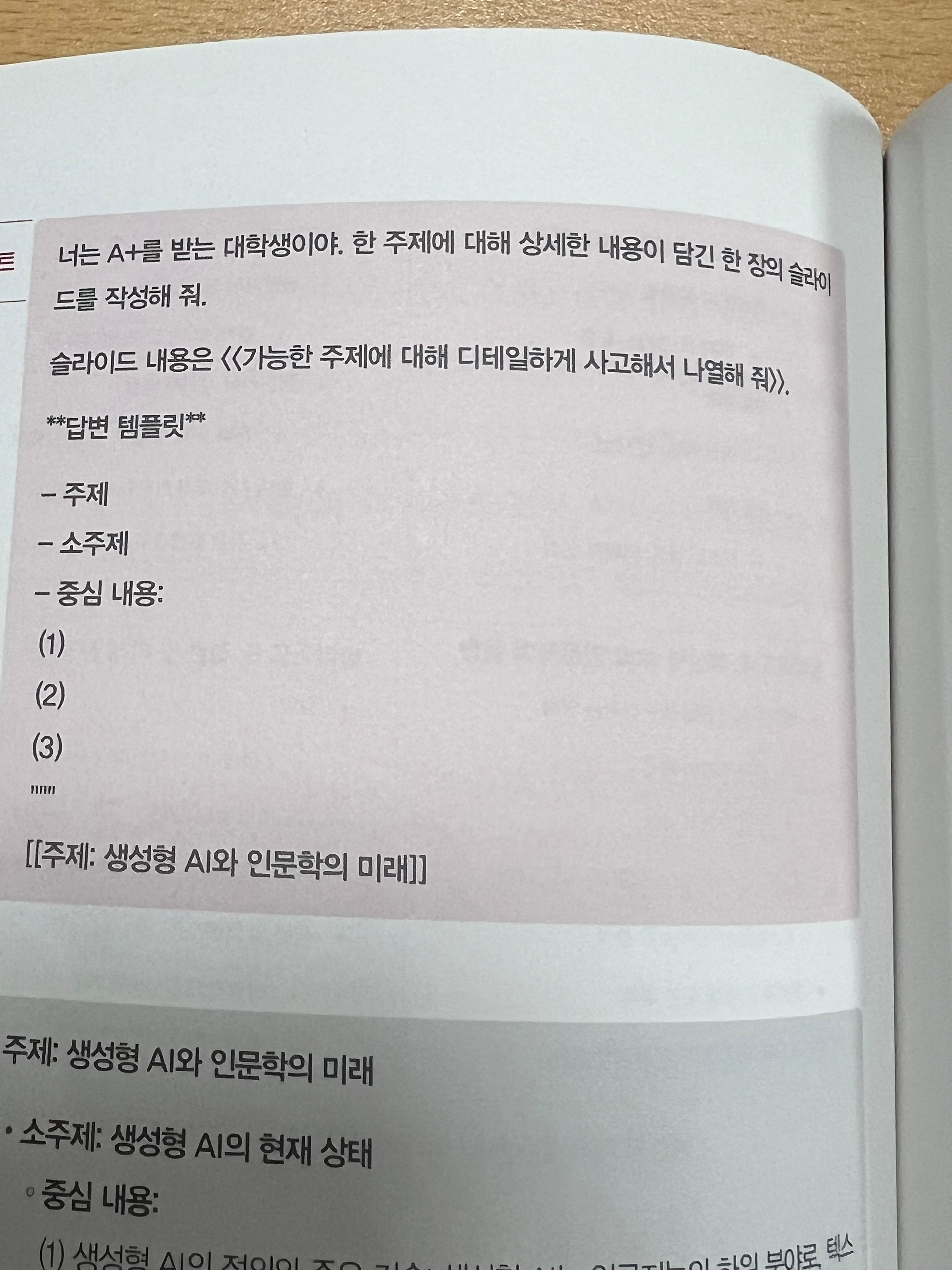 하지만 솔직히 말하면, 저는 처음에 이 책을 읽기가 쉽지 않았습니다. **생소한 개념과 전문적인 용어**가 많아서 초반에는 어려움을 느꼈지만, 책 중반부의 **실제 프롬프트 사례** 덕분에 많은 인사이트를 얻을 수 있었습니다.