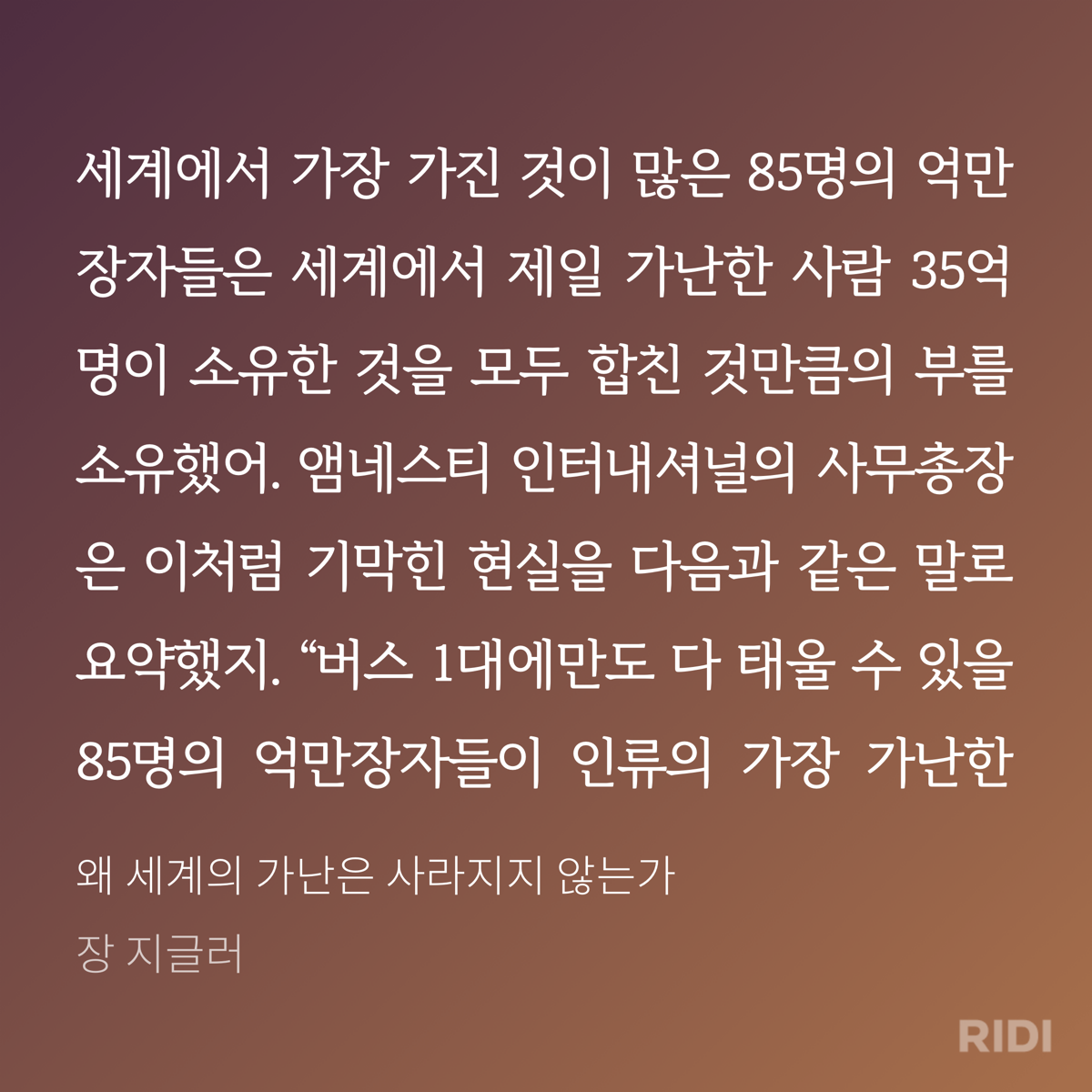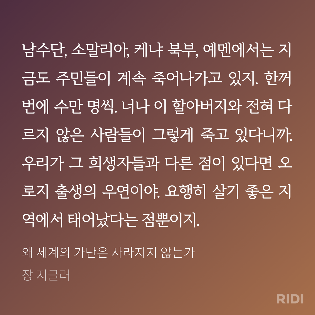 저자는 책을 통해 신자유주의를 추앙하는 자본주의를 비판한다. 지금까지 내가 알고 있는 자본주의에 대한 생각이 잘못되었다는 인식하게 했다. 새천년이 시작된 이후 인류는 역사상 처음으로 물자의 풍족함을 누리고 있다. 지구에는 부가 넘치고 있다. 사용 가능한 물자의 양이 인류에게 꼭 필요한 만큼을 훨씬 뛰어넘고 있다. 그럼에도 왜 세계의 가난은 사라지지 않을까? 왜 세계의 절반은 굶주리는가? 작가는 그 원인으로 자본주의를 지목하고 있다. 불평등의 문제다. 욕심을 버릴 수 있다면, 모두가 적어도 굶주림으로 인해 죽어가는 이들은 없을 텐데 그렇지 못하다.