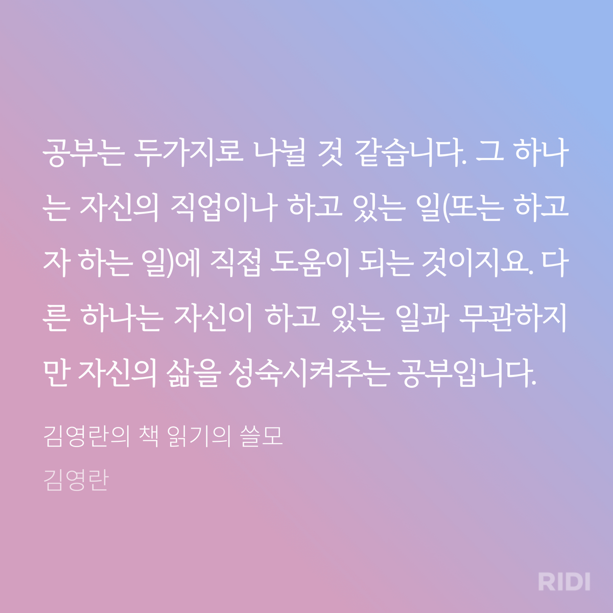 이 책에서는 그녀가 법률적인 이야기를 하지 않는다. 그래서 좋았다. 만약 법률적인 얘기를 했더라면 나는 이 책을 읽지 않았다. 그녀도 책에서 공부에 대해서 언급하고 있다. 그녀가 말하는 공부는 두 가지로 구분된다. 그 하나는 자신의 직업이나 하고 있는 일에 직접 도움이 되는 것이고, 다른 하나는 자신이 하고 있는 일과 무관하지만 자신의 삶을 성숙시켜 주는 공부라고 말한다.