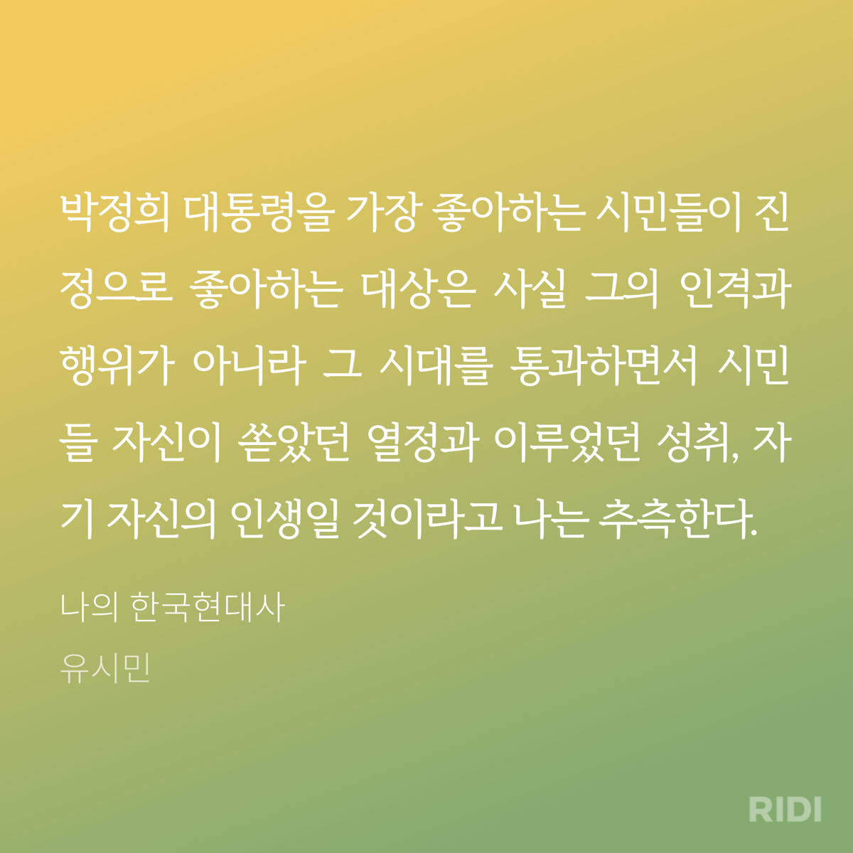 사람들은 자신을 모르고 있다. 박정희 대통령에 대한 향수로 인간 박정희를 좋아하는 것이 아니라 암울하고 힘들었던 시대를, 그 역경을 이겨내고 지금의 자리에 오기까지 자신이 쏟았던 영정과 이루었던 성취, 자기 자신의 인생을 좋아한다는 말에 공감한다. 많은 사람들이 진정 자신이 좋아하는 것이 무엇인지를 깨달았으면 한다. 그리고 이 책을 통해 권력자들이 내게 해 줄 수 있는 게 무엇이고, 그들이 진정 나를 위하는 사람인지 제대로 깨달았으면 한다.